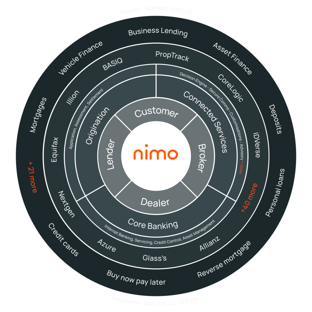 Nimo provides an end-to-end digital banking system that automates the entire product lifecycle, from digital application and automated credit decisioning to settlement and servicing. Built specifically for the Australian market, it supports more than 24 products including mortgages, personal loans, small business lending and asset finance. It also has more than 55 native integrations with premium financial services including local credit bureaus and property data providers.